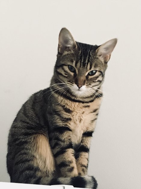 Ligner en bengalkatt. Hvit under haken ellers tigerstripet i beigegrå med sorte striper. Sky, leken, nyskjerrig. Har lilla halsbånd med bjelle og tlf nr, men kan være falt av.