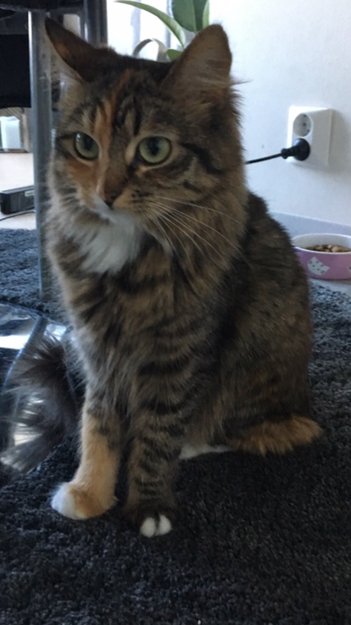 Pelsen til Lucy er orange/beige/grå/sort og hvit.