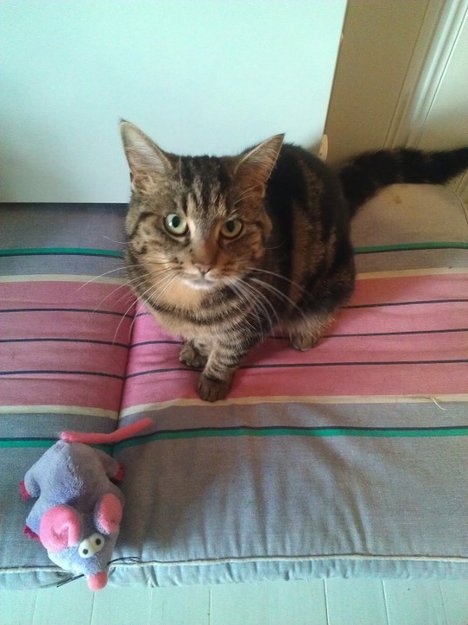 Hun er litt tynn, og ikke stor. Skeptisk til fremmede. Grønn M i øret, chippet, sterilisert.