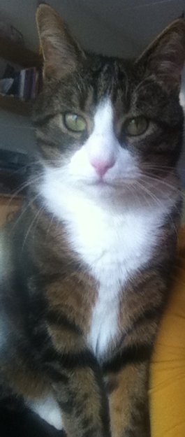 Han er sort, beige og hvit. Han er hvit rundt snute-partiet og på brystet. Hvite poter. Resten av kroppen er sort og beige. Fargene er veldig blandet. Han har helt rosa snute. Katten er veldig kosete. Han er chippet.