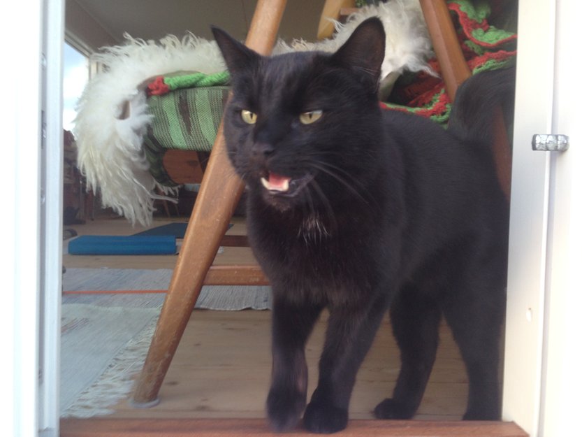 Carlos er snart 5 år. En ung, slank, vakker sort korthåra hannkatt, med glitrende gule øyne. Han er ganske så tøff. Medium, liten og det jeg vil kalle spretten og lur.