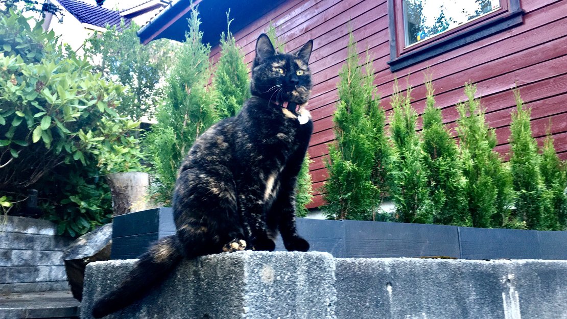 Hun hadde på en halsbånd med et navnemerke med mitt telefonnummer (95246912), og er “chipped”. 2 år gammel. Tricolor skilpadde med lysebrune flekker over øynene.