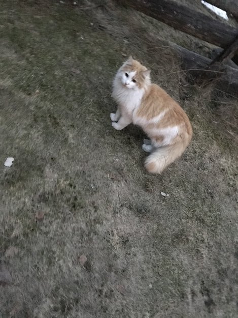 Veldig uredd, nysgjerrig, leken og kosete katt. Oransje og hvit. Den har en brun flekk ved siden av nesen og seg egt ganske ung ut.