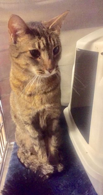 Slank, langlemmet hunnkatt med brungrå kort pels med sorte striper, flekker. Menneskekjær. Kortere pels på venstre side av magen.