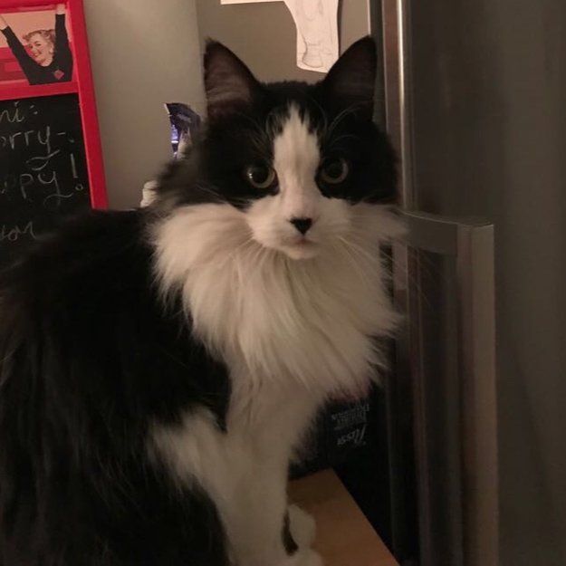 Sort på rygg og bakside hodet. Hvit i fjeset og under hele magen. Sort hjerteformet flekk over snuten. Lyder navnet Lucy. Er en utekatt bodd på Tøyen i 9 år før vi nå har flyttet til Kjelsås. Har alltid vært skvetten og skeptisk til fremmede. Er veldig kosete når man først blir kjent med henne. Er merket med chip og tatovert i øret.