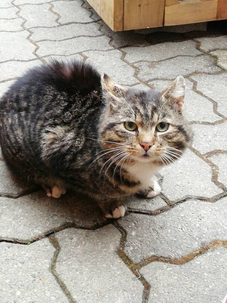 Har hatt besøk av denne pusen i hagen hver kveld/natt de siste ukene. Den er sårete/arrete og tynn. Veldig sulten, og sky. Har sjekket med chipleser, men har ikke chip.