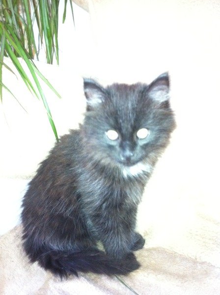 Brun-sort kattunge,halvlang pels,hvit flekk på halsen.
