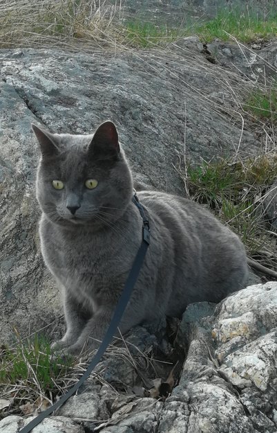 Grå og korthåret.Halen har svake svarte ringer.gul grønne øyne.Veldig snill og forsiktig.ca 5,37 kg
