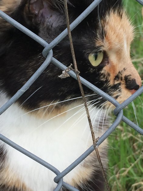 Katt vandrer innafor gjerdet på høyspentanlegget på Ulven. Ser ikke ut til å ha vært borte lenge,men kanskje litt småforvirret med hvordan hun/han kommer seg hjem igjen.