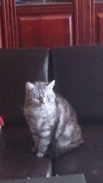 Han er blanding av perser så er litt flat i ansiktet. Mjauer mye og er veldig kosete. Ikke så veldig stor. Ligner litt på finn katten.
