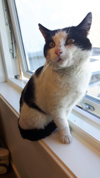 Mange sår og rifter på kroppen. Bittsår i det ene benet. U-kastrert gutt uten ID. Tillitsfull og menneskevant. Stort hakk i det høyre øret.