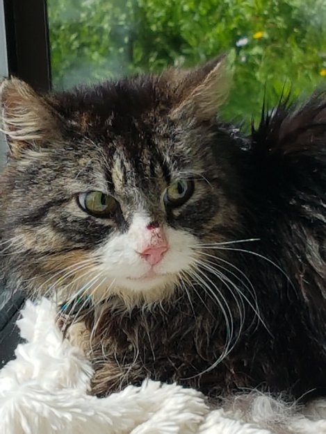 Brun skogskatt mønster. Hvit på brystet. Ustelt og sår på nesen. Skitten og flokete.
