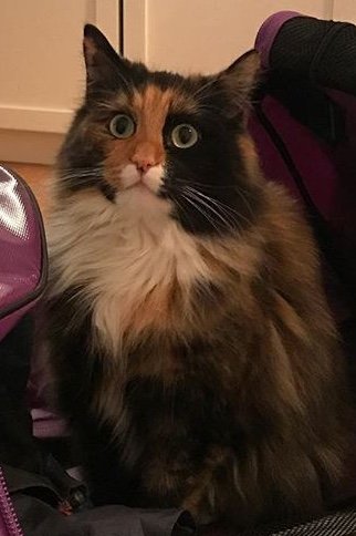 Er utekatt, men bor egentlig i Drammen. Ble holdt innendørs når vi passet henne. Hoppet ned fra veranda. Har vært hos oss flere ganger men er bare delvis trygg på oss.