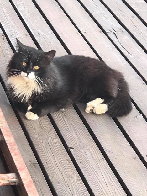 Sort/mørk brun med hvite poter og trolig hvitt bryst. Bildet er trolig av den riktige katten - ikke 100% sikkert.
