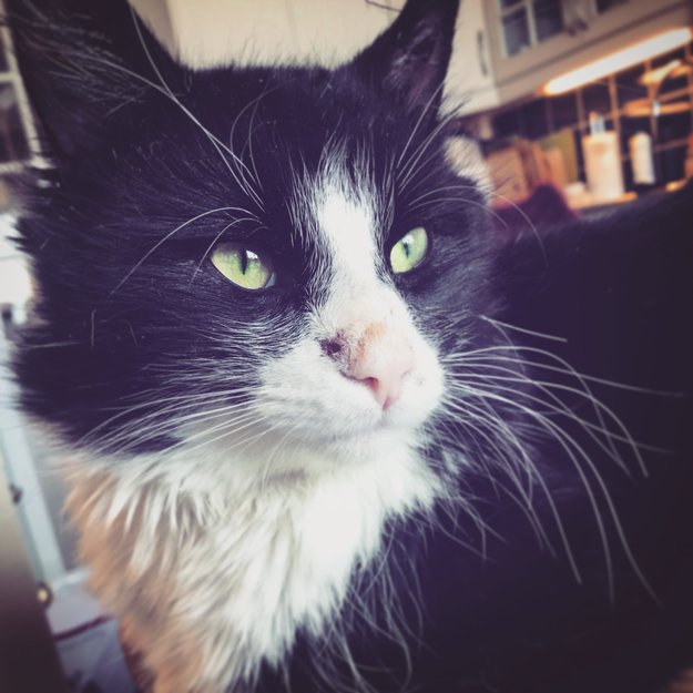 Max er stor, langhåret og svart/hvit. Kastrert, chippet og øremerket. Han er veldig rolig og tillitsfull og vil nok komme til de fleste som ønsker å prate med ham.