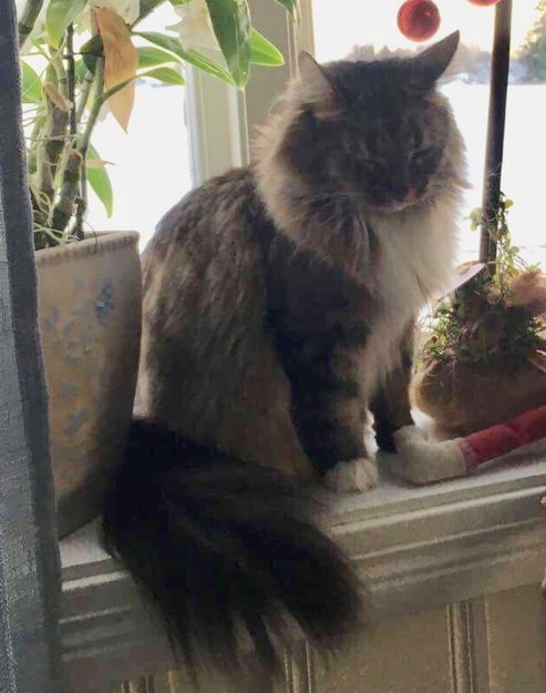 Liten, brungrå jentepus med litt striper nedover bena, hvit brystkasse og hvite føtter. Langhåret og med en enorm hale. Ikke vant til å være ute og mulig redd.