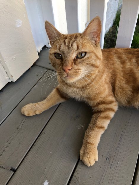 Oransje med lyse striper. Gule øyne og veldig kjælen.