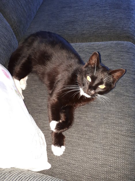 Veldig trygg og kosete. Den har en vortelignende utvekst på nesen. Den fulgte med inn og la seg i sofaen.