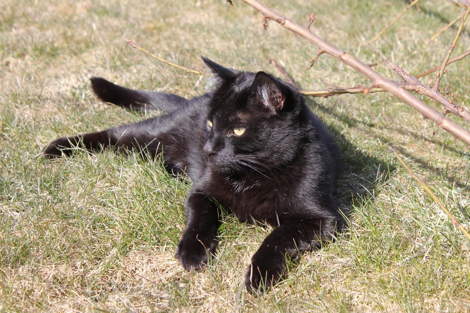 Svart med en hvit flekk nederst på magen. Høy/lang mjauing.