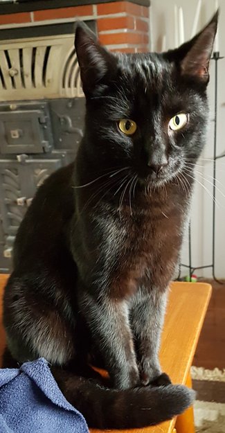 Helsvart, ukastrert hannkatt, ca ett år gammel. Har "slått seg til" i området ved Vinger Hotell i Kongsvinger. Virker sulten, men er ikke tynn, og den er blank og fin i pelsen. Den har vært her i flere uker, og da gjerne hele dagen. Kjennes ikke ut som om den har chip, men dette er planlagt sjekket.