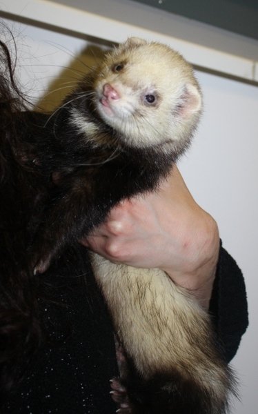 Liten hvit/beige og brun ilder hann. Sosial, snill og nysgjerring.