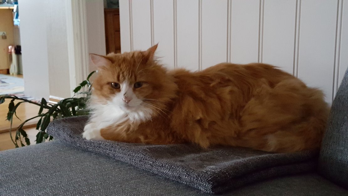 Orange langhåret katt med hvite poter, og hvitt bryst.