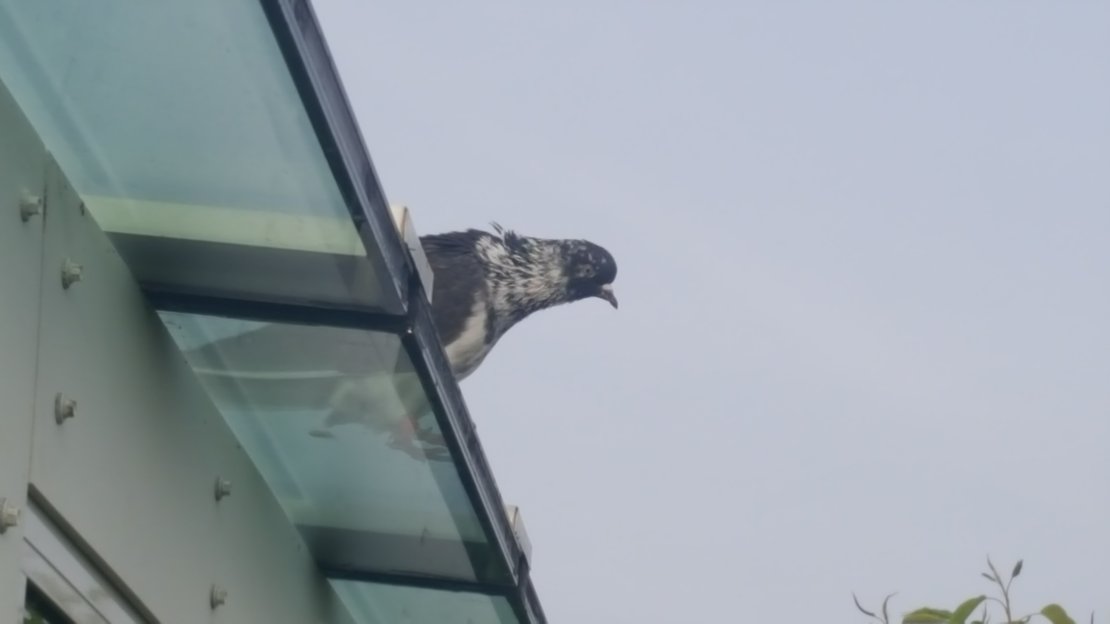 Det kom en due inn i hagen som ikke ville forlate selv om vi var helt tett på den. Vi kunne se at den ikke var redd mennesker, og at den hadde en orange ring i plast på hver for, altså to ringer tilsammen.