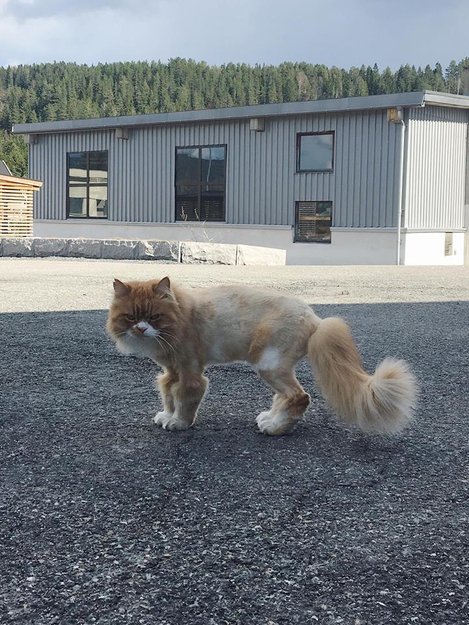 Oransje katt med litt hvitt. Har blitt barbert "løveklipt"