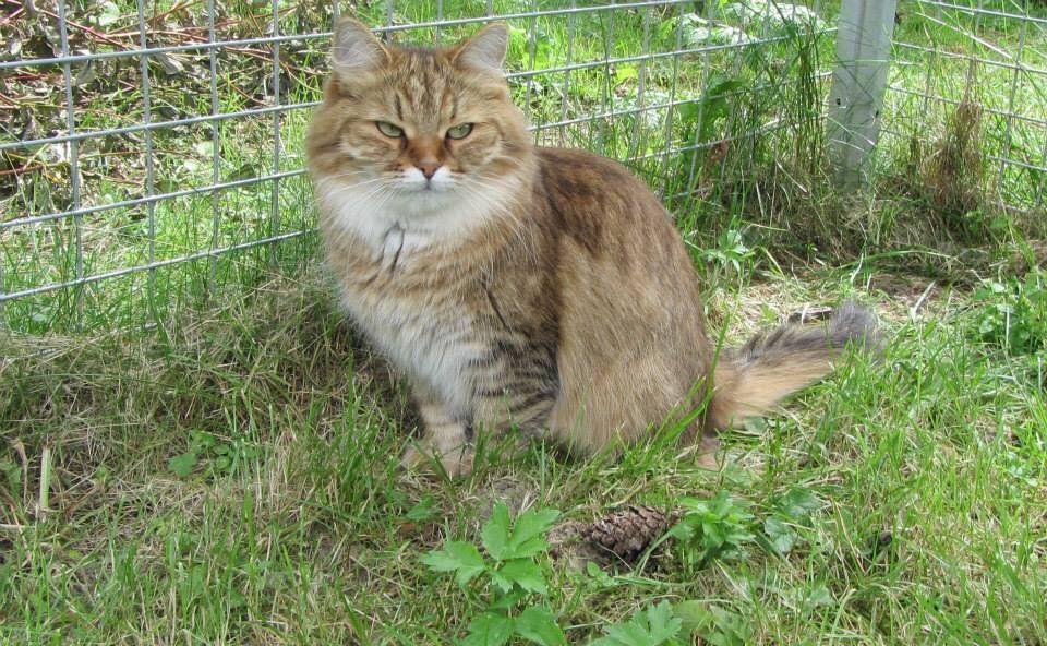 Elixia er brun/hvit med sorte striper og sorte poter. Hun er veldig sosial og kosete.