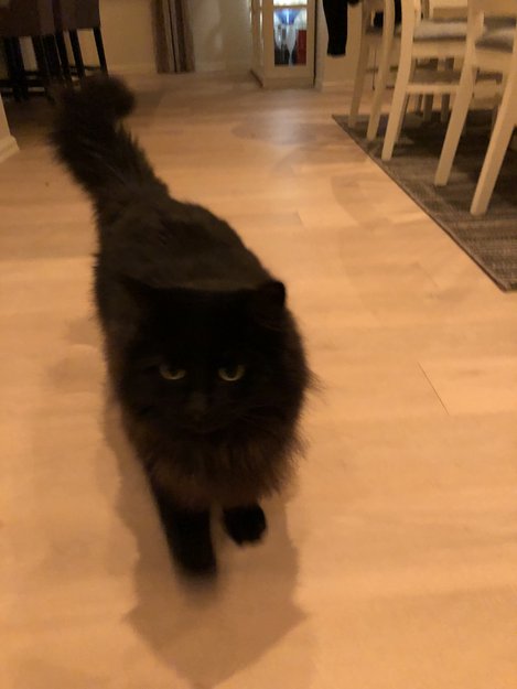 Svart, stor(6,5kg), langhåret hann katt