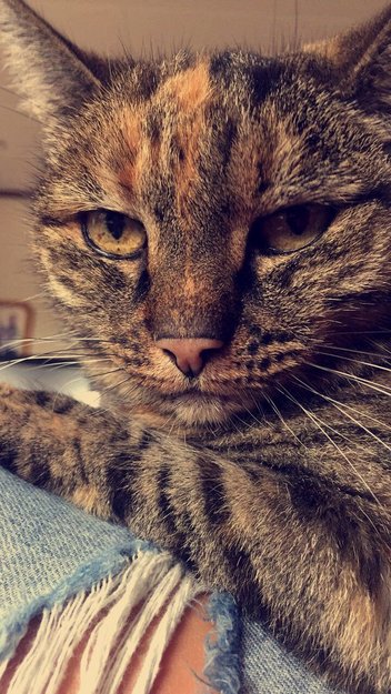 Josefine er en liten og tynn huskatt på 16år. Er veldig kosete, men liker seg best inne. Har en liten knekk nederst på halen.