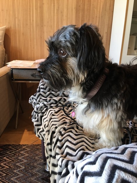 Hunden er rolig og tillitsfull. Utseende litt krøllet i pelsen, sort som hovedfarge med litt gråbrunbeige på bena,halen og bakpart. Ser ut som han har vært borti noe som er nymalt, da halen har hvit maling på seg. Han har bånd av merket "trine" samt en amulett som står: www. trinehundeartikler.no