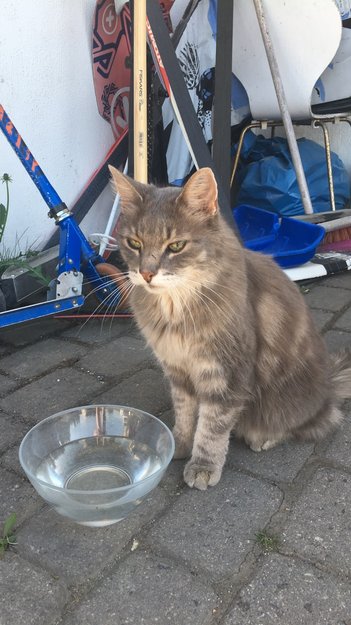 (24.5.18) Unga kom inn i dag og nevnte en katt utenfor huset. Ikke så unormalt, men når vi kom for å hilse på han skjenner vi at han er veldig avmagret og varm. Vi har tatt han inn, og han har fått mat og vann og mulighet for å kjøle seg ned. Han er øremerket og enten nylig kastrert eller at han gikk seg en tur før de rakk å ta bort sting. Han er veldig kontaktsøkende og pratesjuk kar. Hvis ingen melder ifra blir han tatt til ventrinær i morgen (25.5.18) så de kan søke på øremerket.