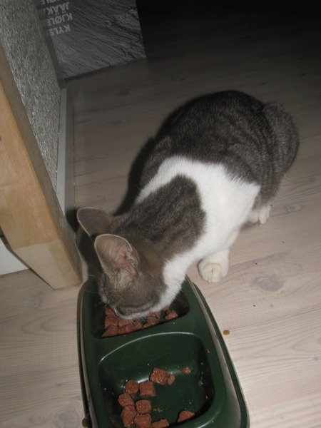 Har visstnok hatt tilhold i området her i flere uker, kom hit og var veldig sugen på å komme inn. Glupsk i matfatet, ligger på verandaen om natten og venter på å komme seg inn til kattematen. Sosial, kosete katt.