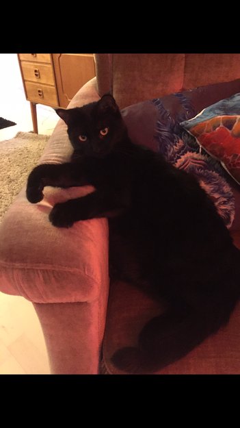 Hun er helt svart. Myk og fin pels. Runde nesten gule øyner. Hun har litt mage og er en stor katt.