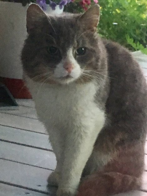 Katten kommer til min veranda. Den har sannsynligvis funnet mat som har vært satt ut til min egen katt. Nå sitter den og kikker inn. Den virker litt trett av dage. Langsom i bevegelsene sløv i blikket. Den lar meg komme nær men ikke nær nok til berøring. Tror jeg har observert den i området i fjorhøst/vinter også. Den virker ikke å høre til noe fast sted.