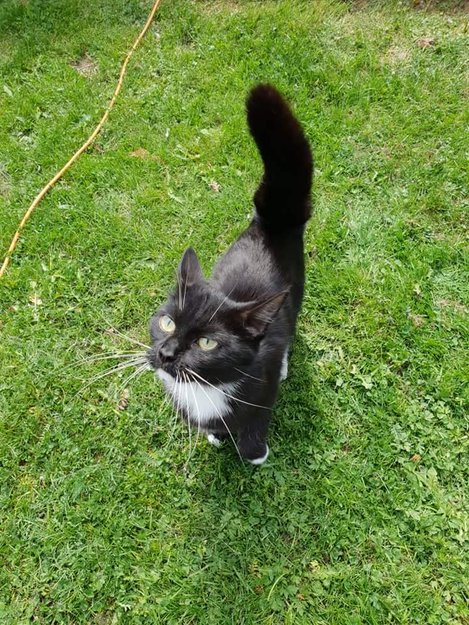 Oppholdt seg i nabolaget i ca en uke. Ingen av naboene har sett pusen før. Tam, pratsom og ganske intens og kontaktsøkende.