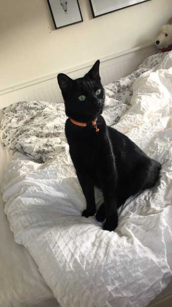 Har et oransj halsbånd med mitt nummer i. Barbert på begge frambein, men pelsen har nesten vokst ut igjen. Har trekt den ene hjørnetannen oppe. Snart tre år gammel gutt.