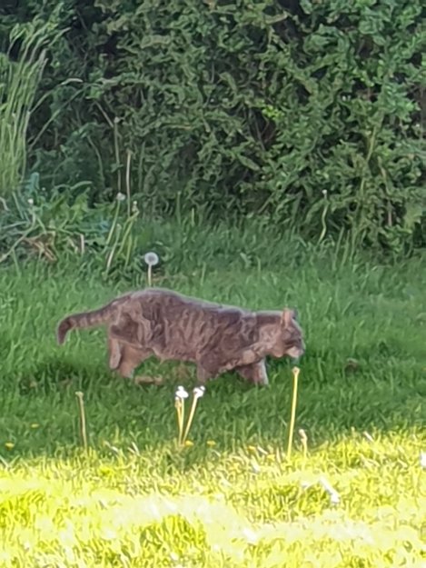 Skadet katt observert. Skade i høyre bakbein, høyre øye og i nakken. Prøvd å lokke på den men den er sky. Den trenger snarlig veterinær tilsyn.
