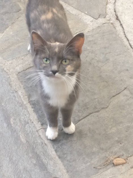 Katten er ung, har ikke chip, ikke sterilisert. Befinner seg mye rundt huset vårt, kanskje pga at vi har hannkatt. Sulten og snill.