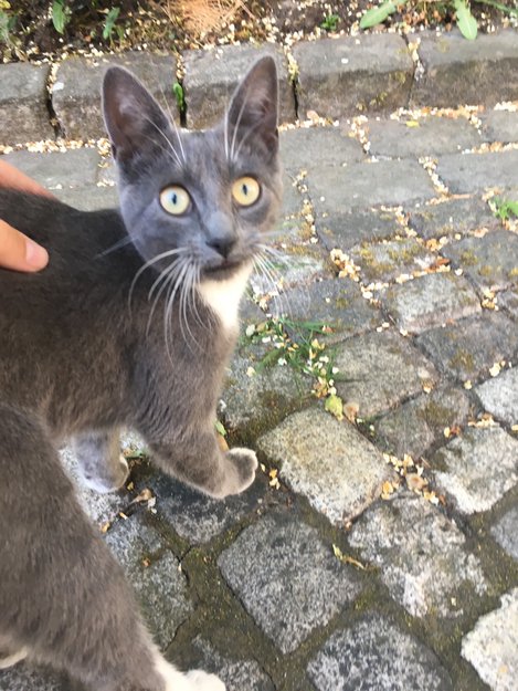 Kattungen gikk mjauende rundt hus og på veien en halvtimes tid før jeg gikk ned til den. Virket glad for å bli tatt hånd om. Veldig tam.