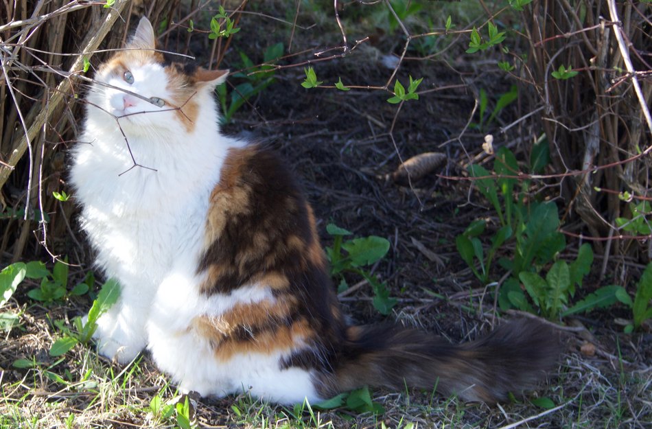 Relativt stor, godt over 5 kilo, 5 år gammel. Hvite føtter, hvit mage, hvitt ansikt, svart og oransje rygg og hode, lang bustete mørk hale.