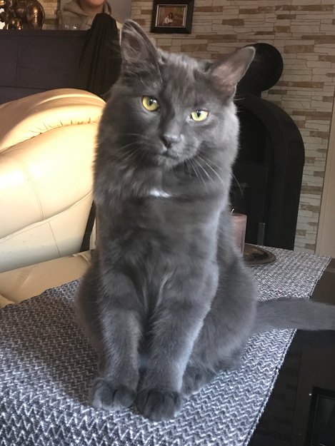 Det er en grå blanding hankatt, med en liten hvit flekk på halsen og litt hvitt farge ned på magen. Den har en stor , busket hale. Katten er ung – 9 måneder, er chippet og kastrert. Pelsen er middles lang. Han har på seg et rødt halsbånd og en til mot flått. Han er lettskremt. Vi savner han veldig.