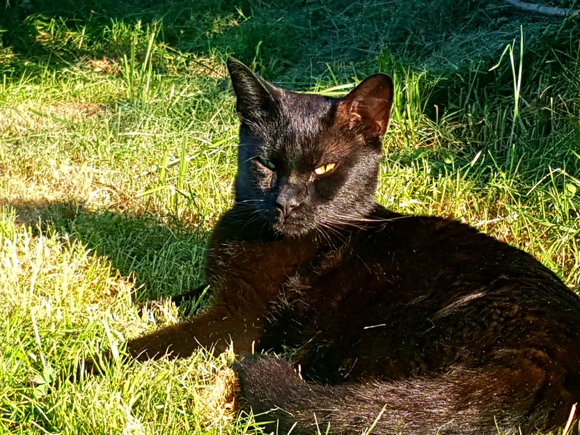 Helt svart og noe hvite under hals. Svart og fin pels med tykk hale. Han er 2 år gammel, ID og kastrert. Flere ganger var borte og fant han etter 5 månter langt fra hjemme 6 km. Blitt hjemme 3 månter og nå han er igjen borte.