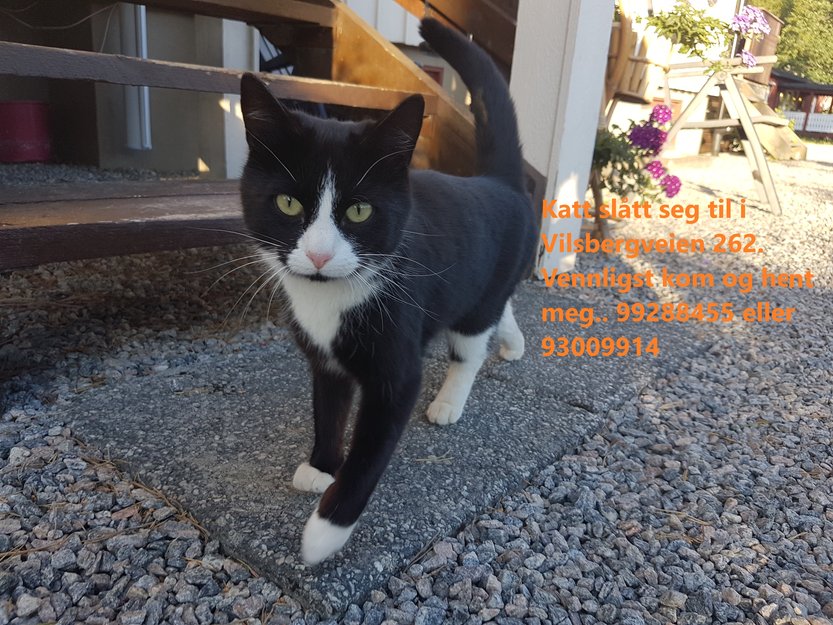 Svart og hvit hunn-katt slått seg til hos oss i juni Er svært kjælen, søker kontakt hele tiden.