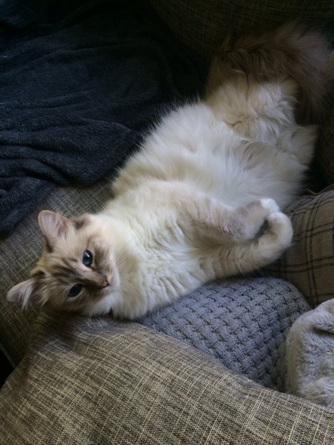 Hun er en blå tabby birma på snart 2 år. Blå øyne.
