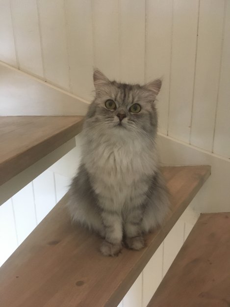 Har rosa halsbånd med tlf nr på. Veldig kosete og nysgjerrig katt. Liten i kroppen, men lang pels i grått og hvitt.