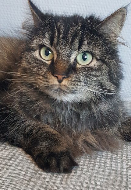Stor katt med mye pels. Hun er kastrert og ID-merket.