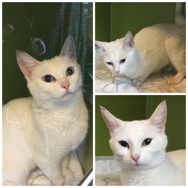 Hvit, korthåret hunnkatt. Litt grå på halen. Ett blått øye og ett gult øye. Snill og sosial.