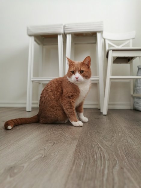 Han har hvit munn og bryst samt en kort og en lang hvit sokk på for labbene. Han er hvit på nedre del av magen. Har en hvit haletipp ellers orange. Har er litt liten og kompakt i forhold til andre hankatter.